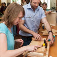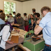 Die zahlreichen Gäste konnten gestärkt von Klöpfern und einem reichhaltigen Kuchenbuffet selbst etwas schreinern, was das Team der Schreinerei vorbereitet hatte, und zu gewinnen gab es am eigens gebauten Glücksrad natürlich auch etwas.